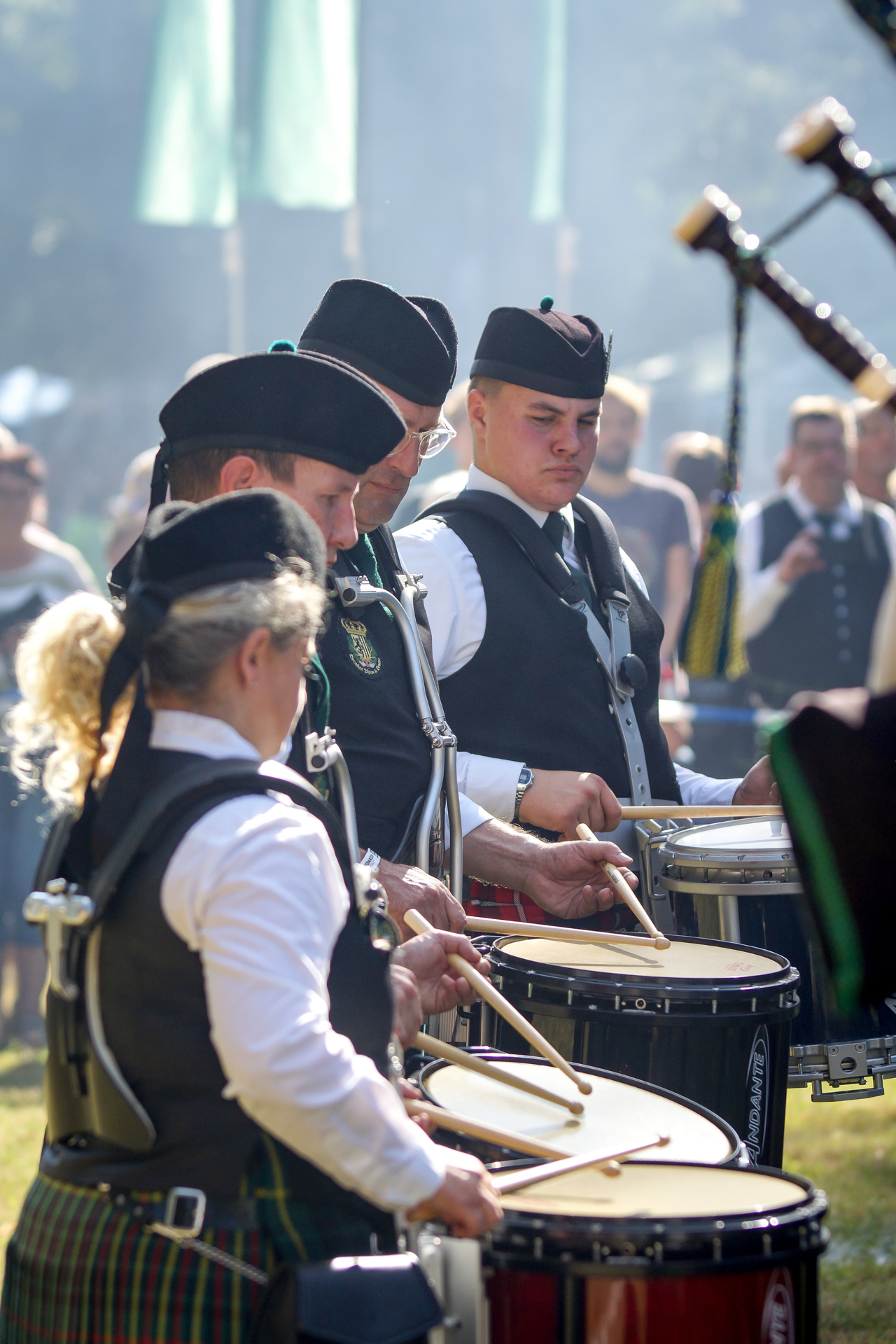 Das Drum Corps einer Pipe Band besteht aus Snare Drums sowie der Midsection (Bass und Tenor) und erfüllt mehrere wichtige Aufgaben. Da die Dudelsäcke ihre Lautstärke kaum verändern können, sorgen vor allem die Snare Drums für rhythmische Spannung und musikalische Dynamik. Die Bass Drum gibt den gleichmäßigen Grundpuls, hält das Tempo stabil und ergänzt zusammen mit den Tenor Drums diesen Puls mit zusätzlichen Akzenten und Klangfarben. Zusammen bilden die Trommeln das rhythmische Fundament der Band und verleihen der Musik Kraft und Tiefe.